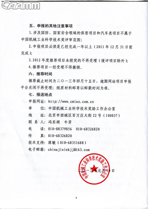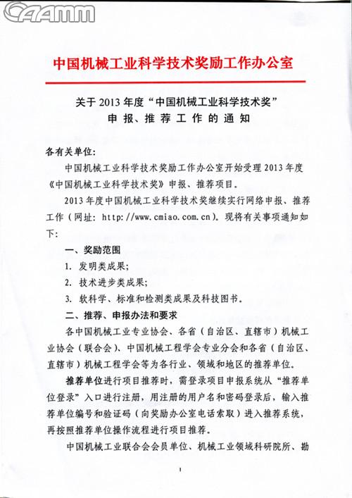 注:中国机械工业科学技术奖2013年申报已经年始,请有关企业抓紧申报,需协会作为推荐单位的企业,请来函并致电010-64830359。