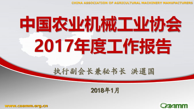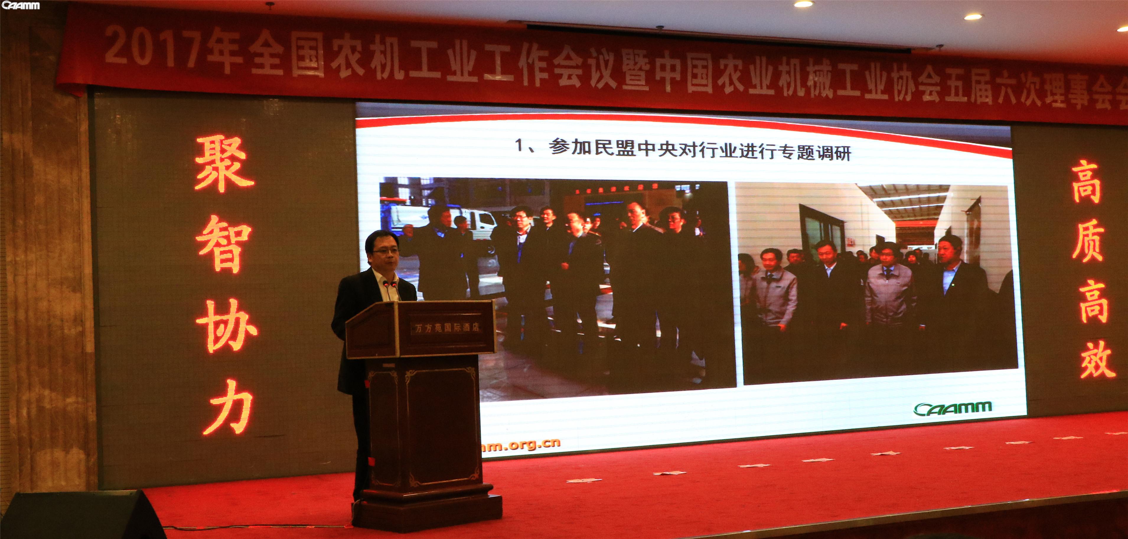 中国农机工业协会副秘书长宁学贵作了2017年中国农机行业整体经济形势分析。介绍了2017年行业经济数据,说明了农机工业各子行业以及不同品类产品的产销情况并对比分析了农机在整个机械工业中的位置。重点总结了本年度行业发展亮点并预测了18年的发展趋势。中国农机工业协会执行副会长兼秘书长洪暹国代表协会向理事会报告了协会秘书处2017年工作及2018年工作思路和重点。