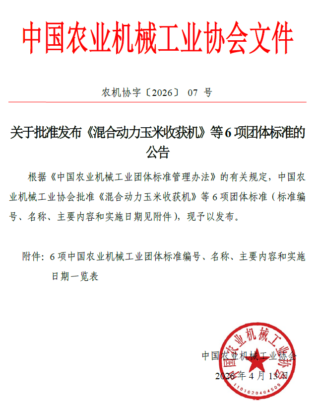 关于批准发布《混合动力玉米收获机》等6项团体标准的公告