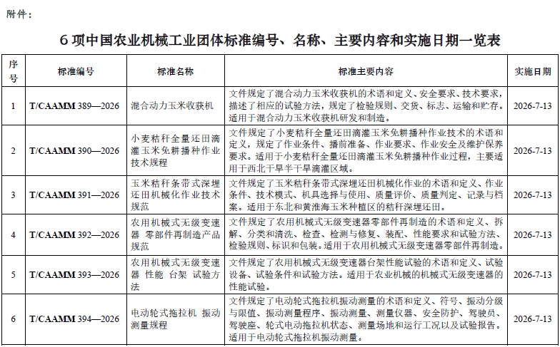 附件:6项中国农业机械工业团体标准编号、名称、主要内容和实施日期一览表.rar